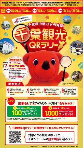 千葉県の魅力を再発見!「千葉観光 QRラリー」の開催期間中に、千葉県内の対象となる観光スポット1ヶ所とイオンモール1ヶ所の計2か所のチェックポイントで二次元バーコードを読み取ると、参加者全員にもれなくチーバくんオリジナル壁紙や、応募でもらえるうれしいWAON POINTをプレゼント!