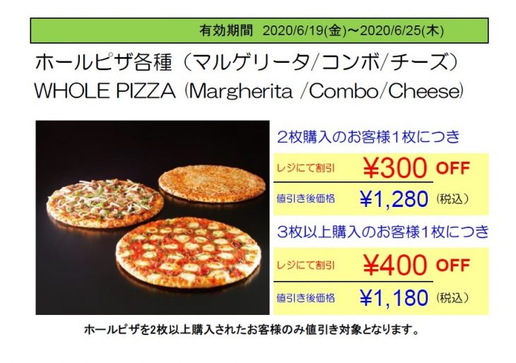 ・ホールピザ各種2枚購入の会員様、1枚につき300円OFF