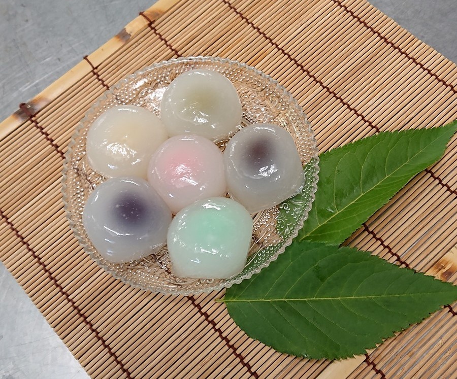 「水まんじゅうはいかがですか?当店の夏の御菓子です。味は、小豆こし餡、桜餡、ゆず餡、抹茶餡、ラムネ餡、ブルーベリー餡の6種類ございます。冷蔵庫で冷やしてお召し上がりください。