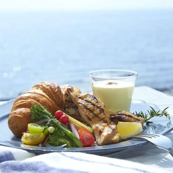 「10月31日(土)までの 期間限定メニュー。開放的なテラススペースで、海を見ながらお食事をお楽しみください」