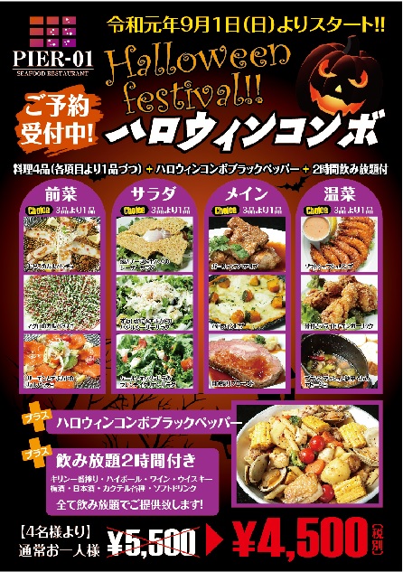 9月1日スタート!選べる4品料理+ハロウィンコンボ+飲み放題2時間付きです