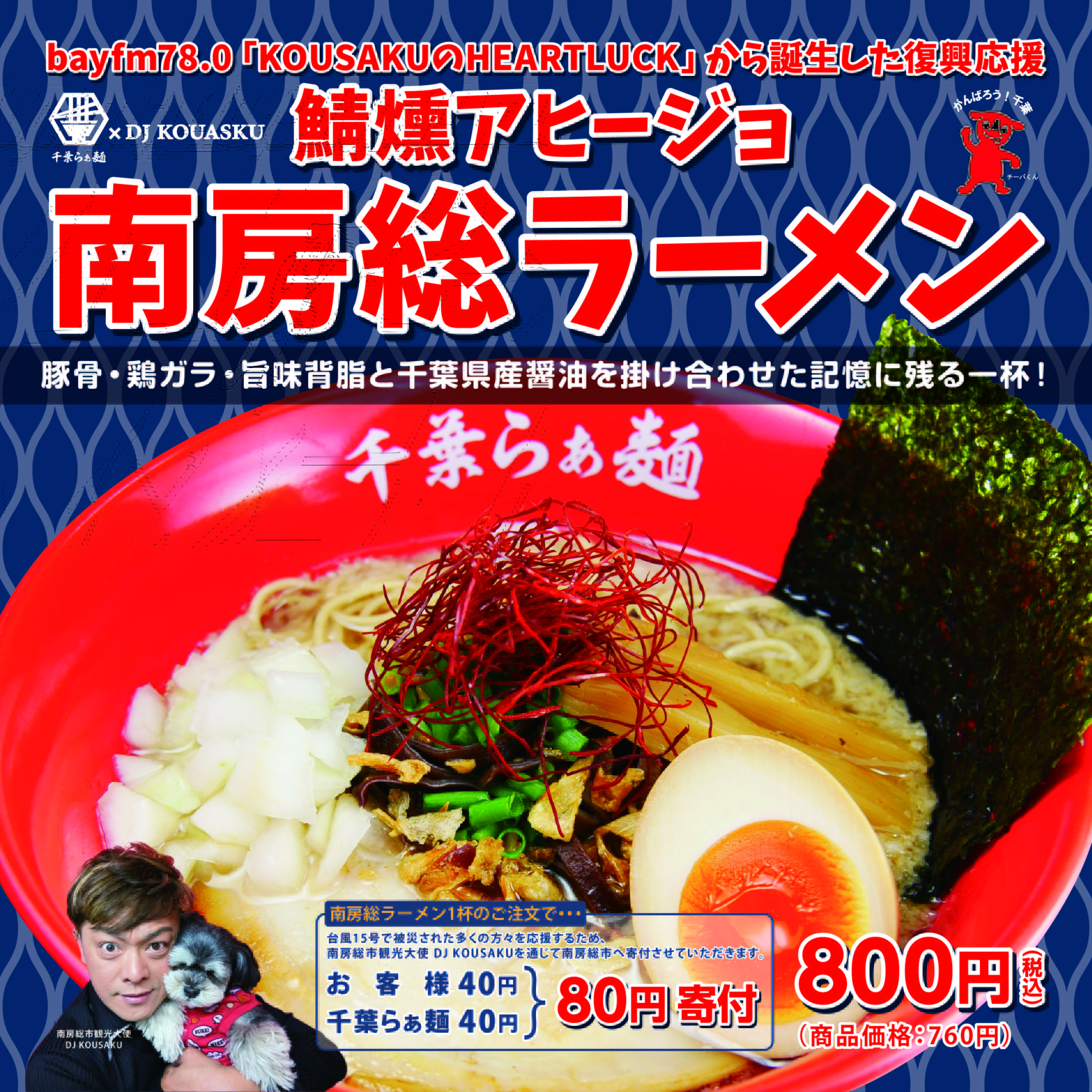 〇寄付:南房総ラーメン1杯のご注文で、お客様40円/千葉らぁ麺40円、合計80円を南房総市へ寄付させていただきます。