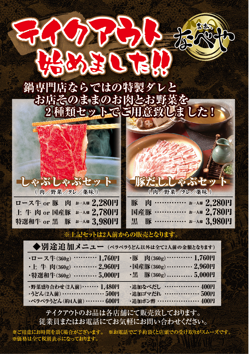 ☆「テイクアウト始めました!!」Ma~なべや 千葉店・みなと店・蘇我店を追加しました(4月24日)