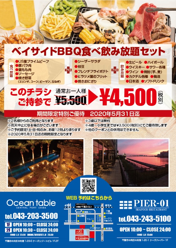 〇PR:オーシャンテーブル最大60名、PIER-01最大40名のお好きなテラスにてみんなでBBQ!食べ放題150分+飲み放題150分です。