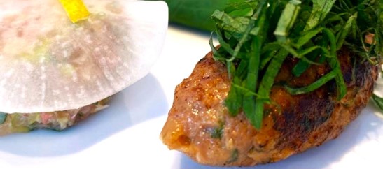 [千葉の郷土料理なめろうと同じ製法で叩いた河豚を大葉で包み焼き上げます]