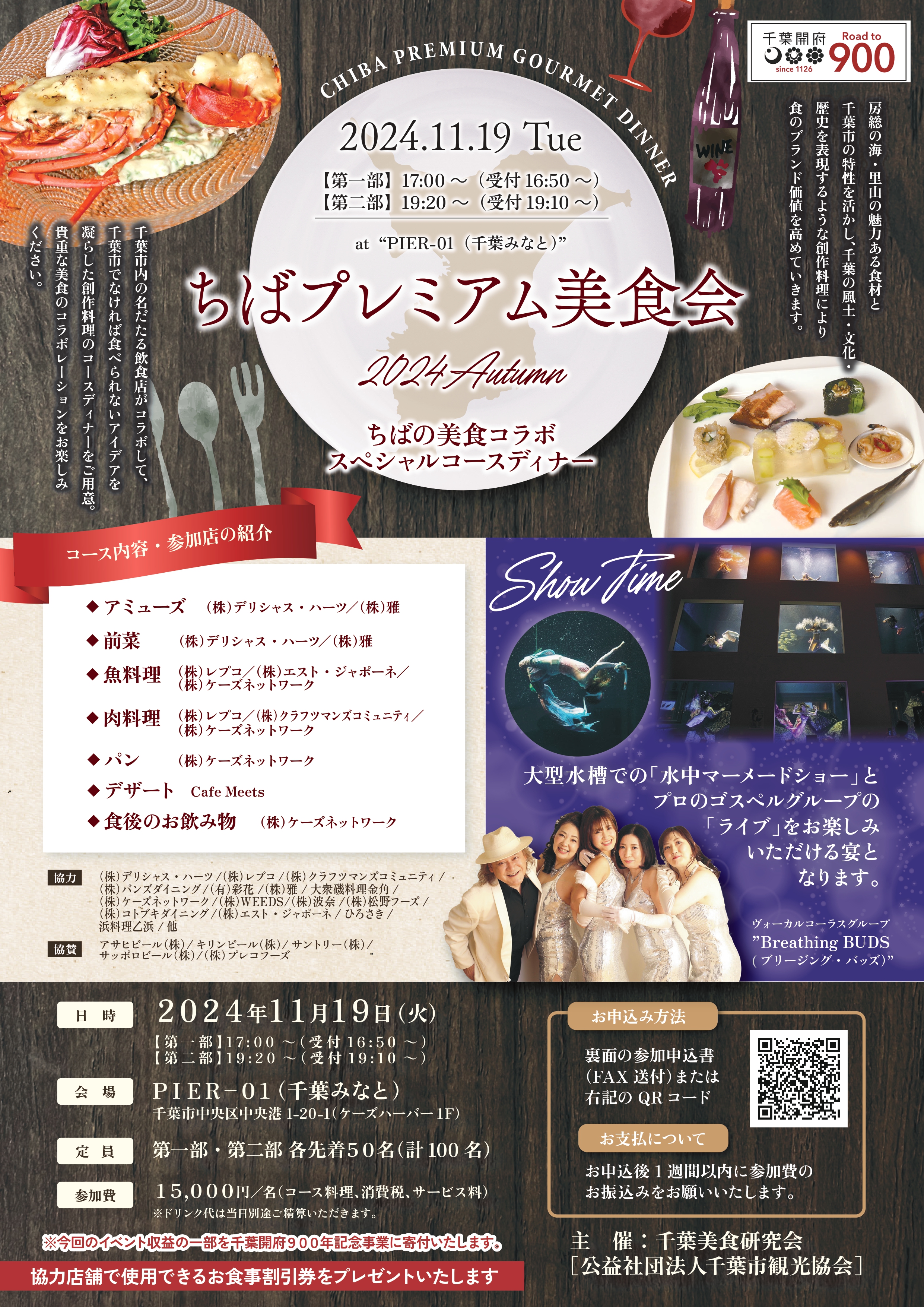 そこで、市内の名だたる飲食店がコラボしてアイデアを凝らした創作料理のコースディナーをゲストにおもてなしする「ちばプレミアム美食会」を下記のとおり開催しますので、お知らせします。なお、本イベント収益の一部を千葉開府900年記念事業に寄付いたします。