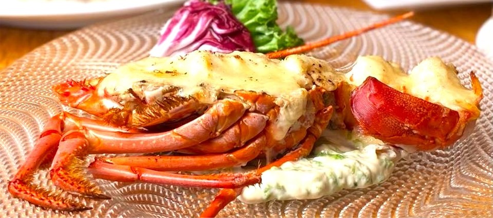[千葉県産伊勢海老を贅沢に使い、生海苔入りの特製クリームソースで]