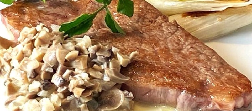 [霜降りのフィレステーキに芳源マッシュルームとトリユフを使用したシャンピニオンソースで]