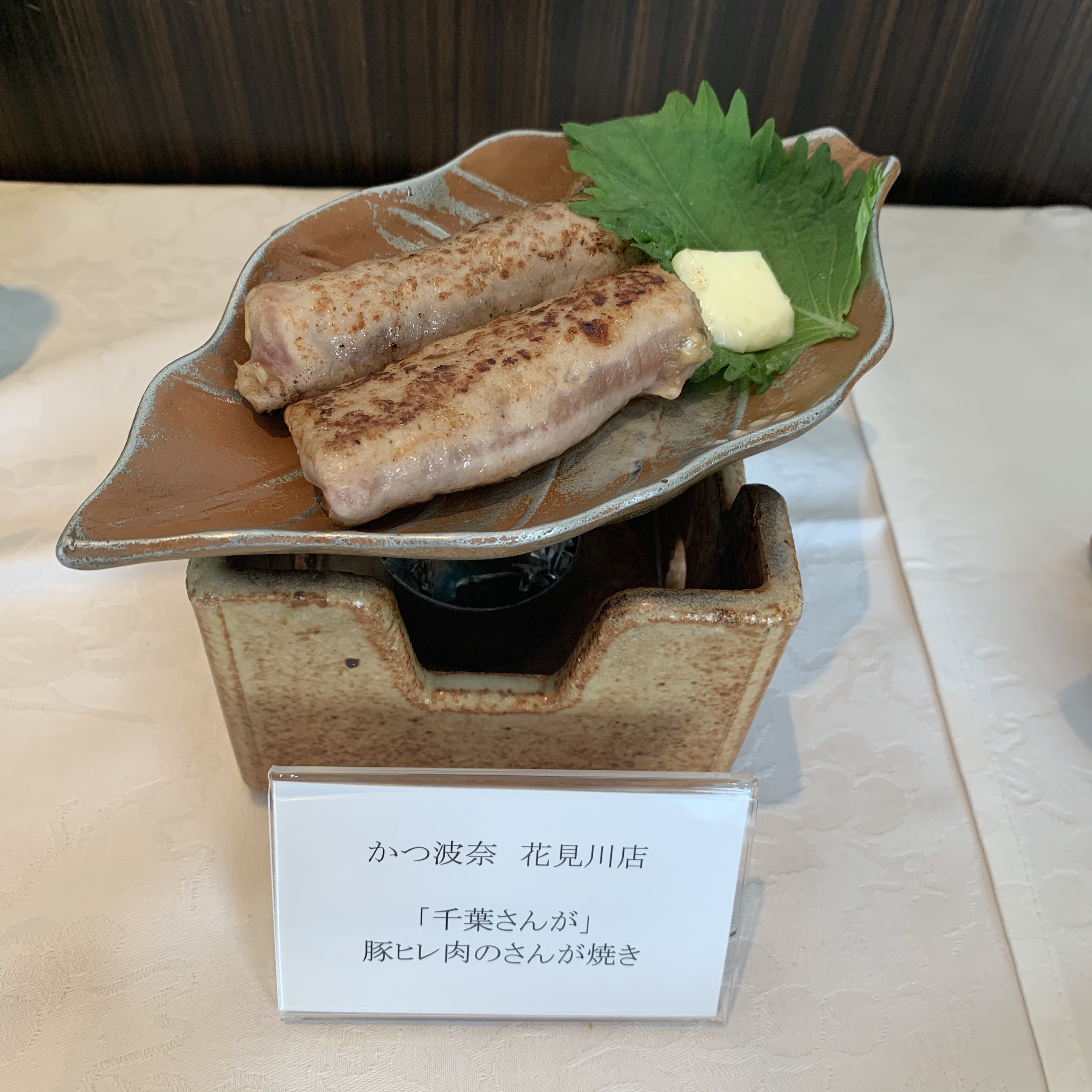 「かつ波奈」は、「豚ヒレ肉のさんが焼き」。牡蠣、ホタテ、しょうが、ネギ、大葉、みそを包丁でたたいて、豚ヒレ肉で巻いて焼きます。試作段階では、エビを入れてみたりもしたそうです。創作料理、試行錯誤があるのですね。豚ヒレ肉は、千葉県旭市産だそうで、とてもやわらかでした。牡蠣やホタテのうま味が調味料となって、肉の味を引き立てていました。