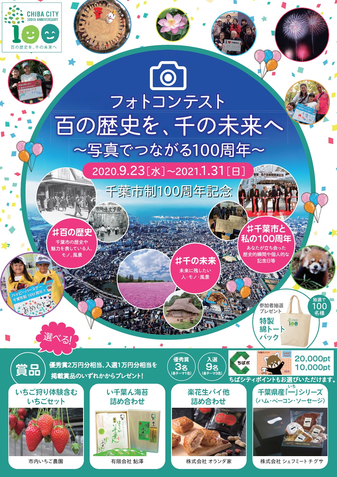 2021年1月1日、市制施行から100年を迎える千葉市。これを記念して3つのテーマで写真を募集。「百の歴史を、千の未来へ ~写真でつながる100周年~」ぜひご参加ください。