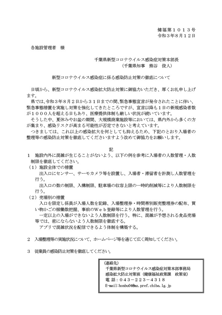 新型コロナウイルス感染症に係る感染防止対策の徹底についてのお願い(千葉県8月12日付)