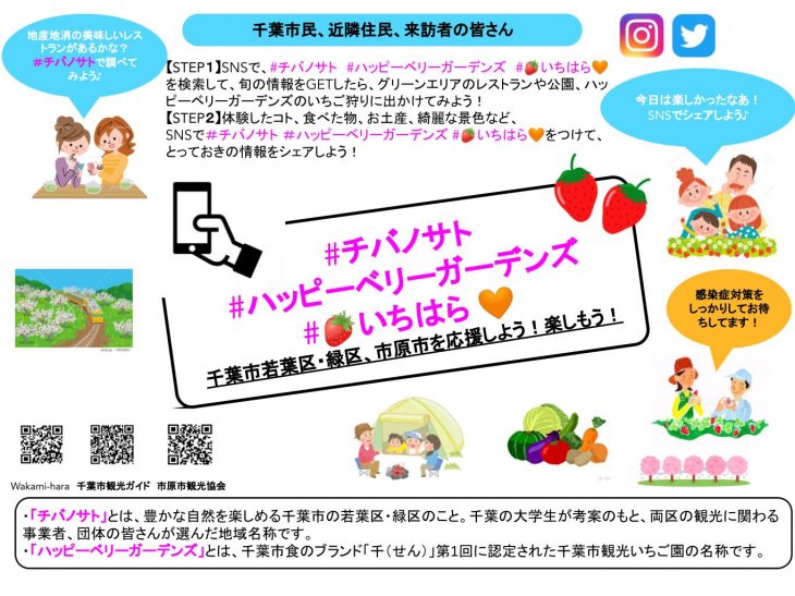 また市原市の情報は、ハッシュタグに「(イチゴ)いちはら(ハート)」(カッコ内はそれぞれマーク)をつけて、とっておきの旬の観光情報や体験したコトをSNS(Twitter、Instagram)でシェアしましょう♪