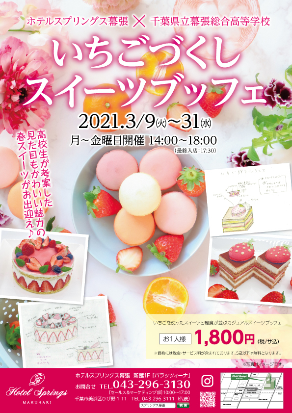 今回、春のスペシャル企画として幕張総合高等学校の美術部とクッキング同好会の皆さんが考案した見た目もかわいい魅力の春スイーツとホテルパティシエのスイーツを迎賓館を会場にして「いちごづくしスイーツブッフェ」を開催しております。