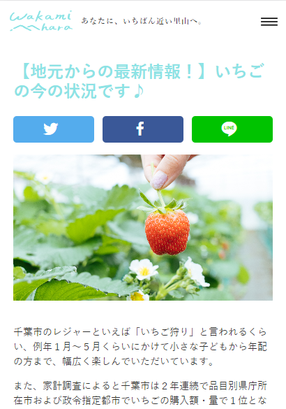 2020.11.26 トピックス 【地元からの最新情報!】いちごの今の状況です♪ 【みつばちファーム】さんの最新情報を追加しました! 千葉市民に愛されるいちごの生育状況や、旬の時期に向けてのいちご農園の取り組みなどをお伝えしていきます。 ↓↓↓ 画像をタップ(クリック)で、詳細ページを開きます。 ↑↑↑ 記事の続きは、画像をタップ(クリック)で、詳細ページを開きます。