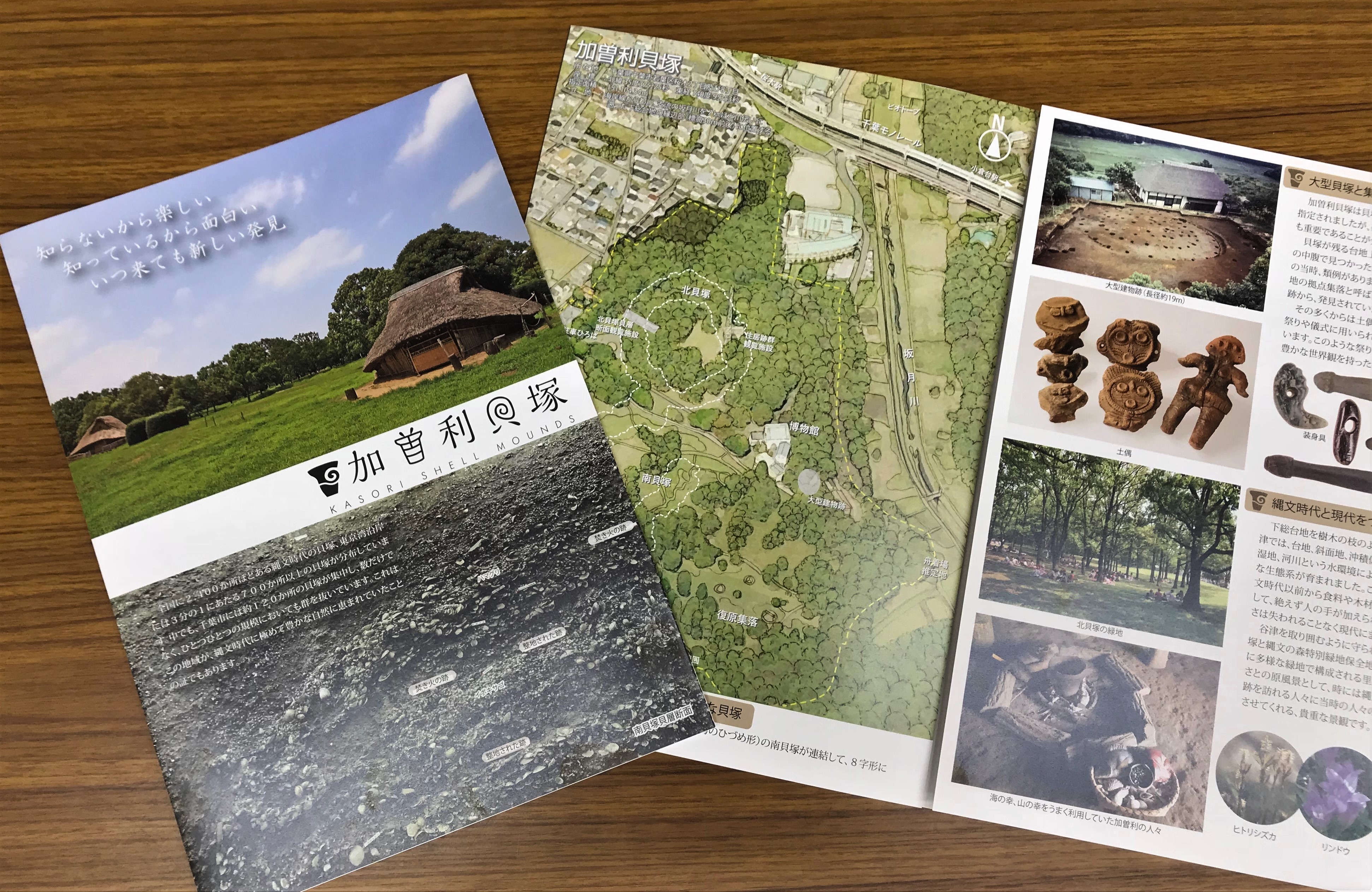 日本最大級の加曽利貝塚の特長をはじめ、発掘調査の変遷、縄文土器、かそりーぬの紹介などを収録した加曽利貝塚のパンフレット(写真下:A4サイズ、発行:平成29年3月千葉市教育委員会)を、千葉駅前と海浜幕張駅構内の千葉市観光情報センター(開設時間:平日10:00~18:00、土日祝は17:00まで)にて配布中です。