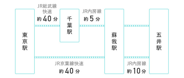 東京駅 →【JR京葉線快速 約40分】→ 蘇我駅 →【JR内房線 約10分】→ 五井駅