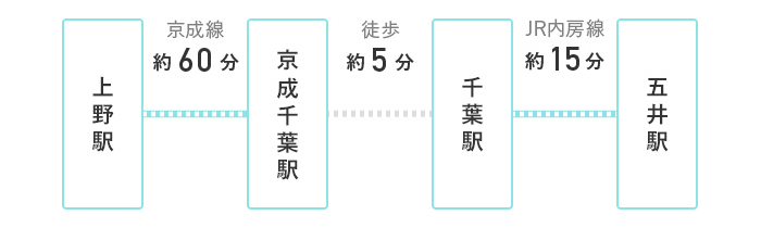 上野駅 →【京成線 約60分】→ 京成千葉駅 →【徒歩 5分】→ 千葉駅 →【JR内房線 約15分】→ 五井駅