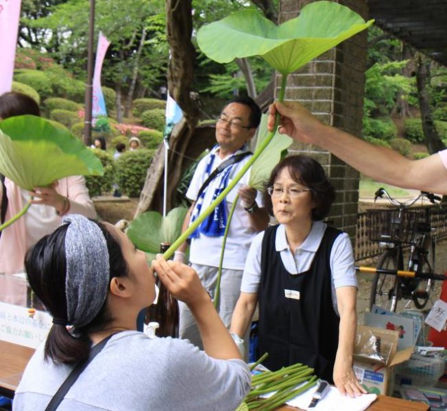 大人気の象鼻杯(ぞうびはい/ハスの葉にお酒や飲み物を注ぎ、茎から飲む)の体験や、各種演奏、販売、講習会など、今回もイベント盛りだくさん!!