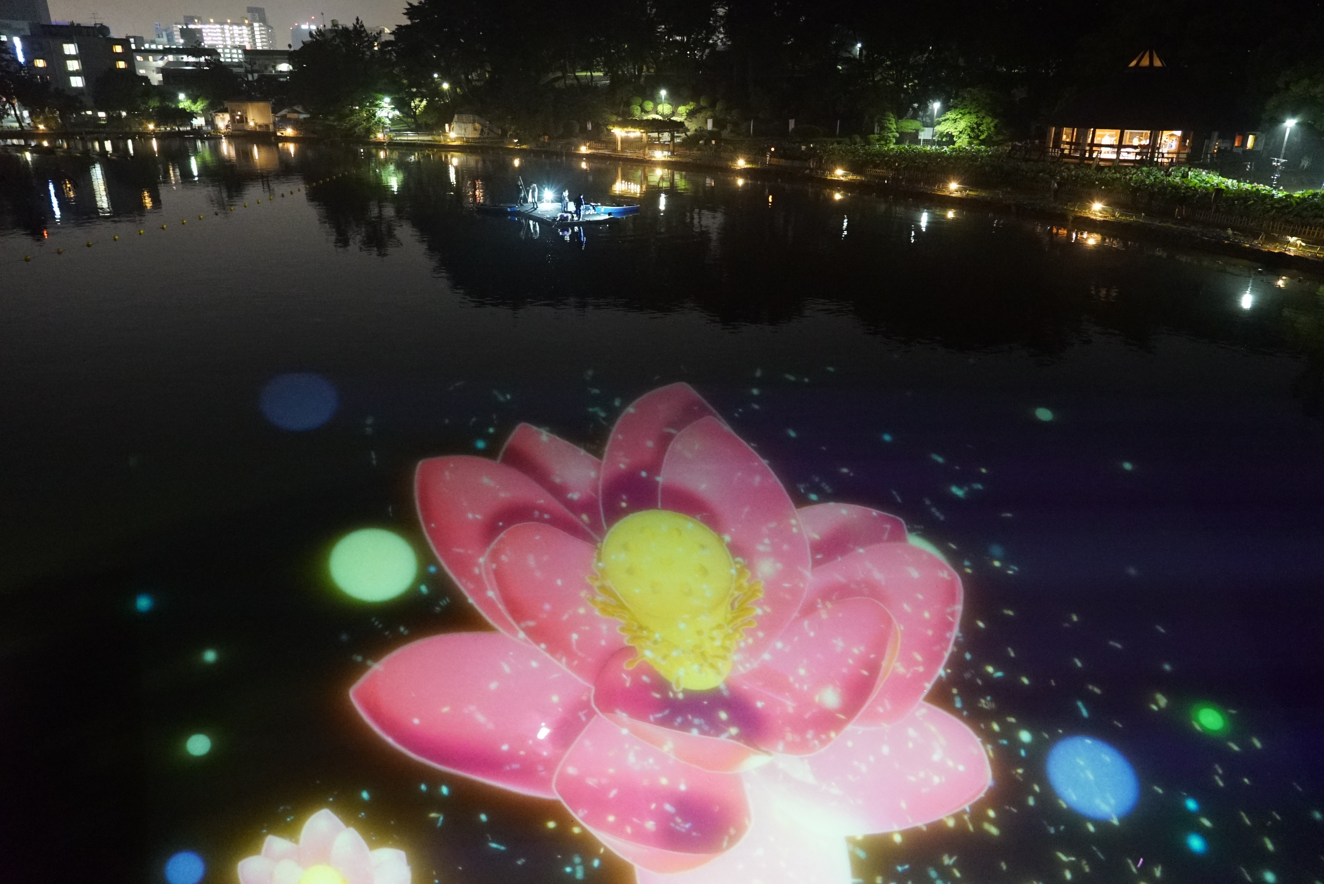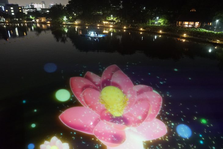 夜には咲かないはずのハスの花が綿打池に咲き誇るプロジェクションマッピングは必見。