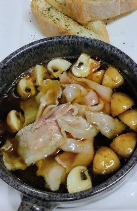 千葉県産の豚バラ肉とマッシュルームを黒アヒージョに仕上げました。豚バラと醤油の旨味にマッシュルームの食感をお楽しみください
