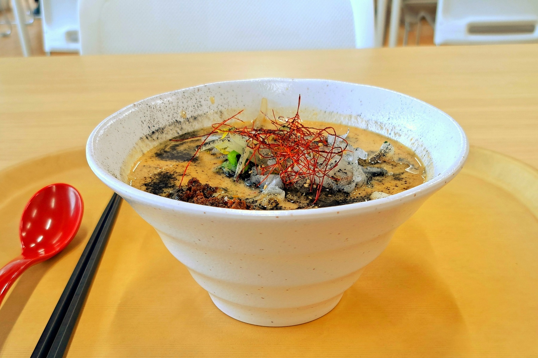 ●千葉市産竹炭パウダーがかかった濃厚豆乳担々麺(¥700)チンゲン菜・豆乳・ゴマは薬膳では血行促進に期待できる組合せになっております。また、美肌効果に期待できる珍しい食材の白きくらげも使用しています。-