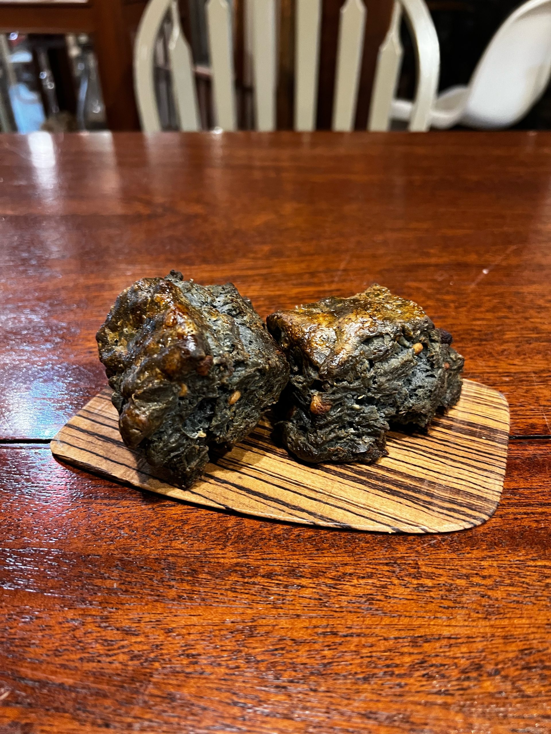 ●竹炭芝麻球「漆黒」(1個¥450)千葉市でも乱雑に生え、驚異的に成長する竹は『竹害』になっており、その竹で継続可能な商品はできないかと思案しておりました。