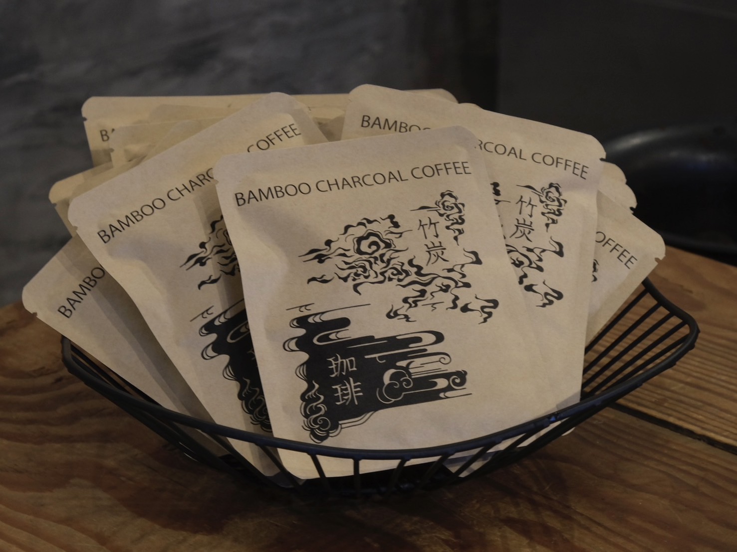●竹炭ドリップパック(¥300)深煎りのブレンドに竹炭パウダーを加えたお土産商品です。当店の珈琲豆を竹炭パウダーの相性が良くまろやかなコーヒーに仕上げりました。