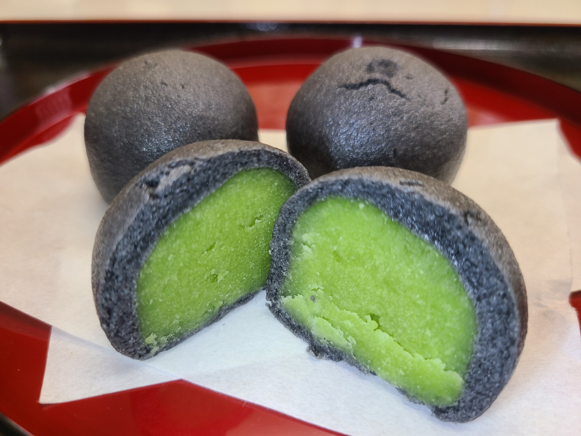 ●まっくろけ饅頭(¥300)生地に竹炭を練り込んだ薯蕷饅頭です。JA香取の「ふさこがね」の上新粉を使用しています。中の餡子は、若竹のイメージで、若草色に染めた白餡です。