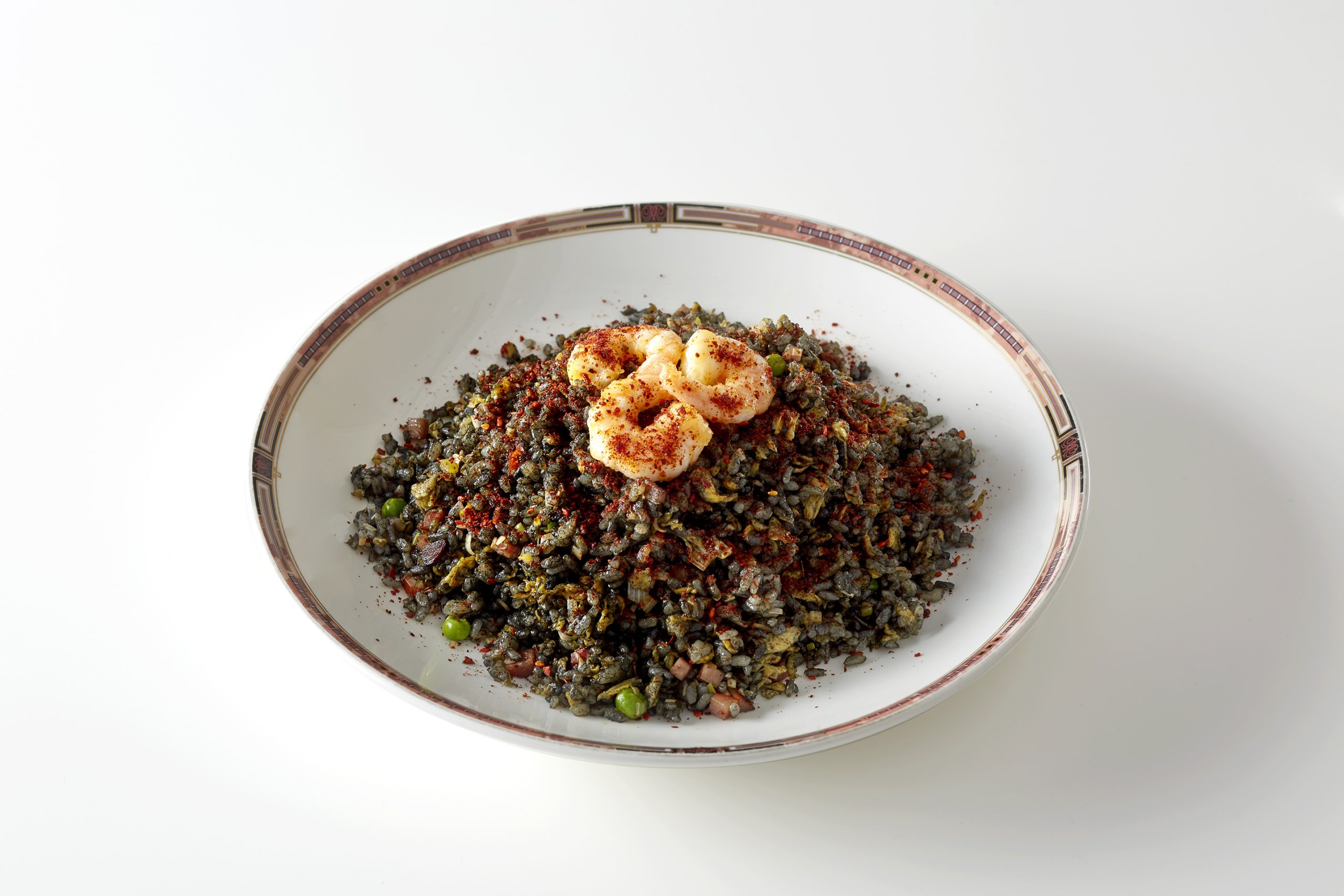 ●竹炭香辣炒飯「黒鬼」(¥1,600)【竹炭芝麻球“漆黒”】の開発過程で生まれたメニューのひとつ。