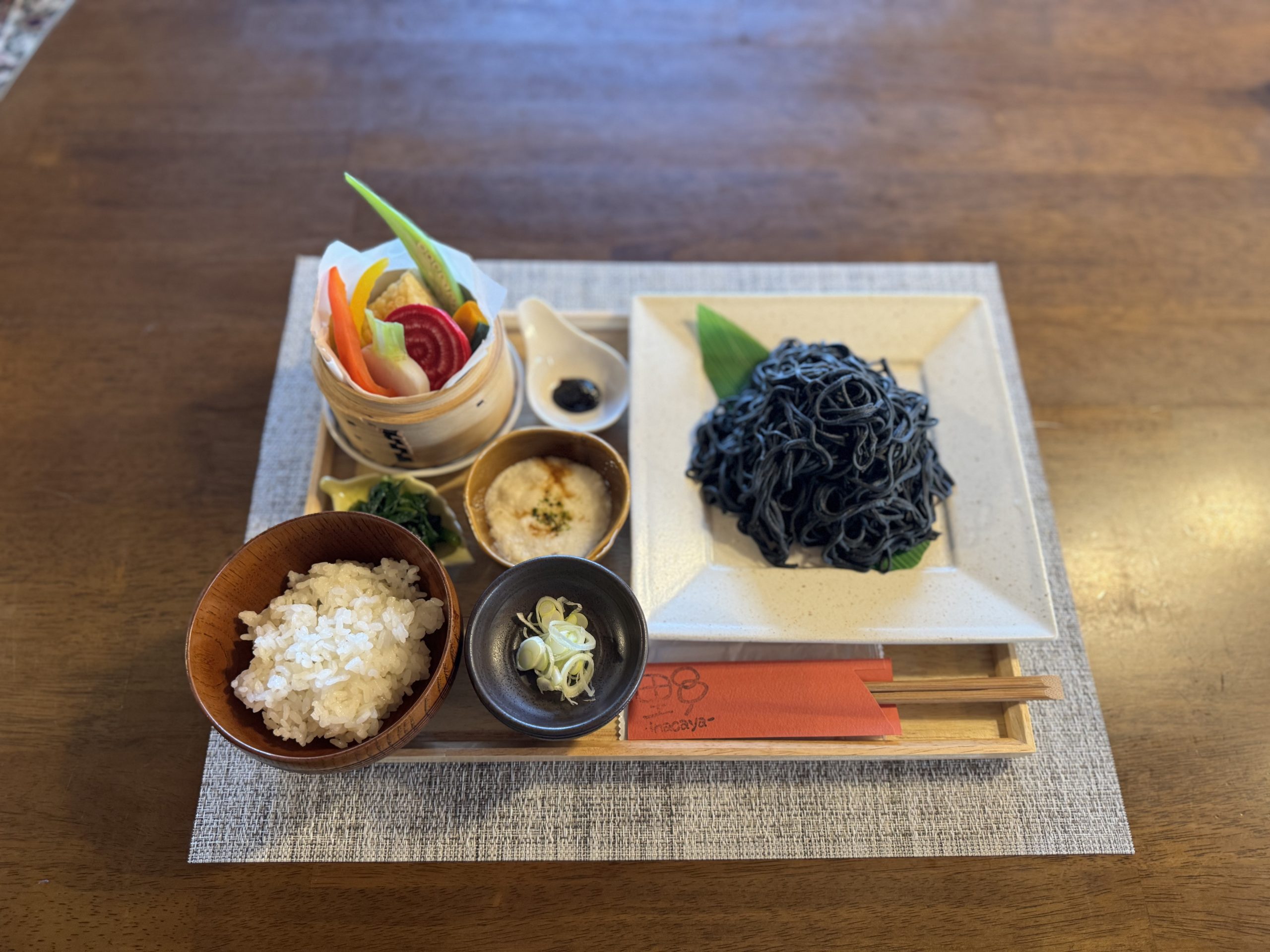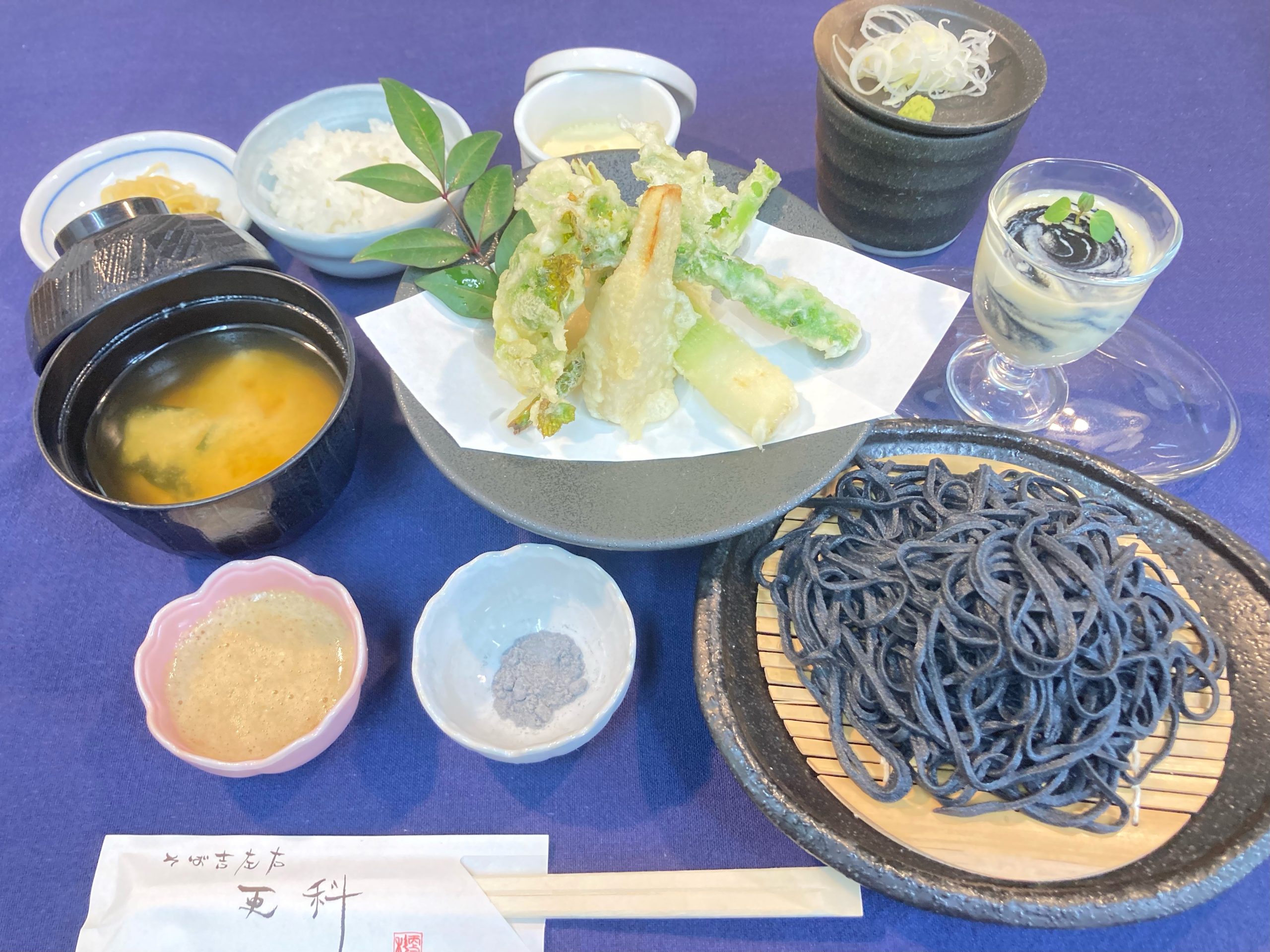 ●蕎麦御膳(¥1800(ドリンク付き))商標登録【竹炭在来黒蕎麦】と 地元季節野菜のせいろ蒸しや千葉県産大和芋のとろろなどを一緒にお楽しみください☆-
