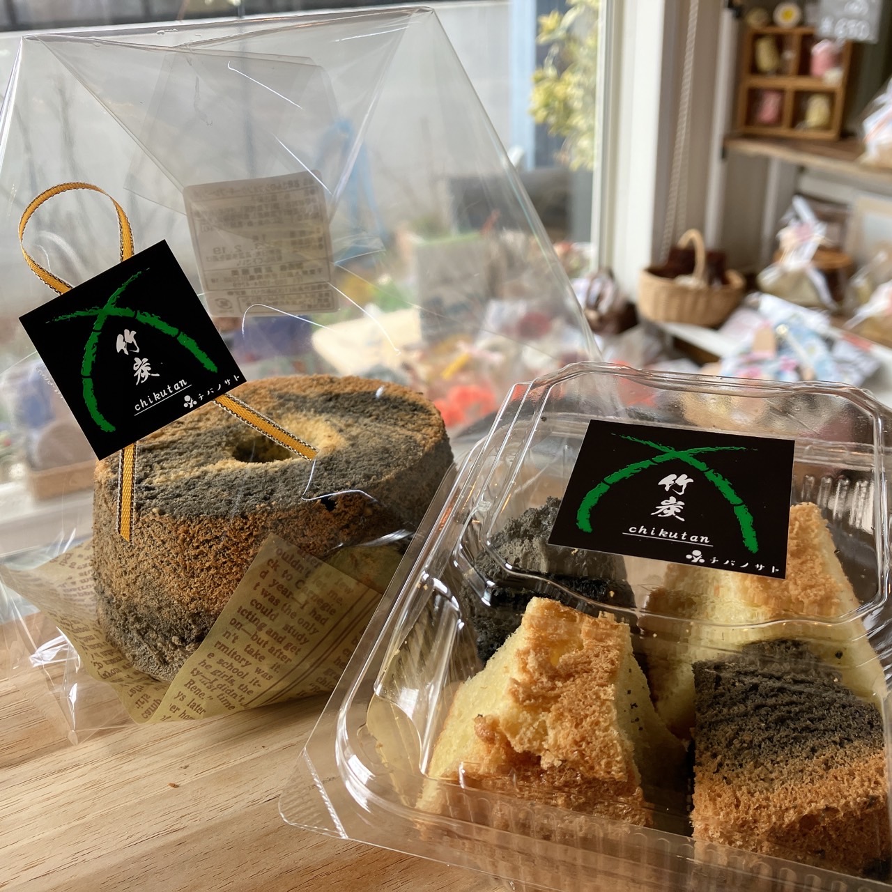 ●竹炭シフォンケーキ(カット¥380、ホール¥1050)お母さんの作るシフォンケーキは無添加で何度も食べたくなる優しい味です。竹炭パウダーを使うことで無添加二重丸です。※週末販売、ホール売りは予約のみ