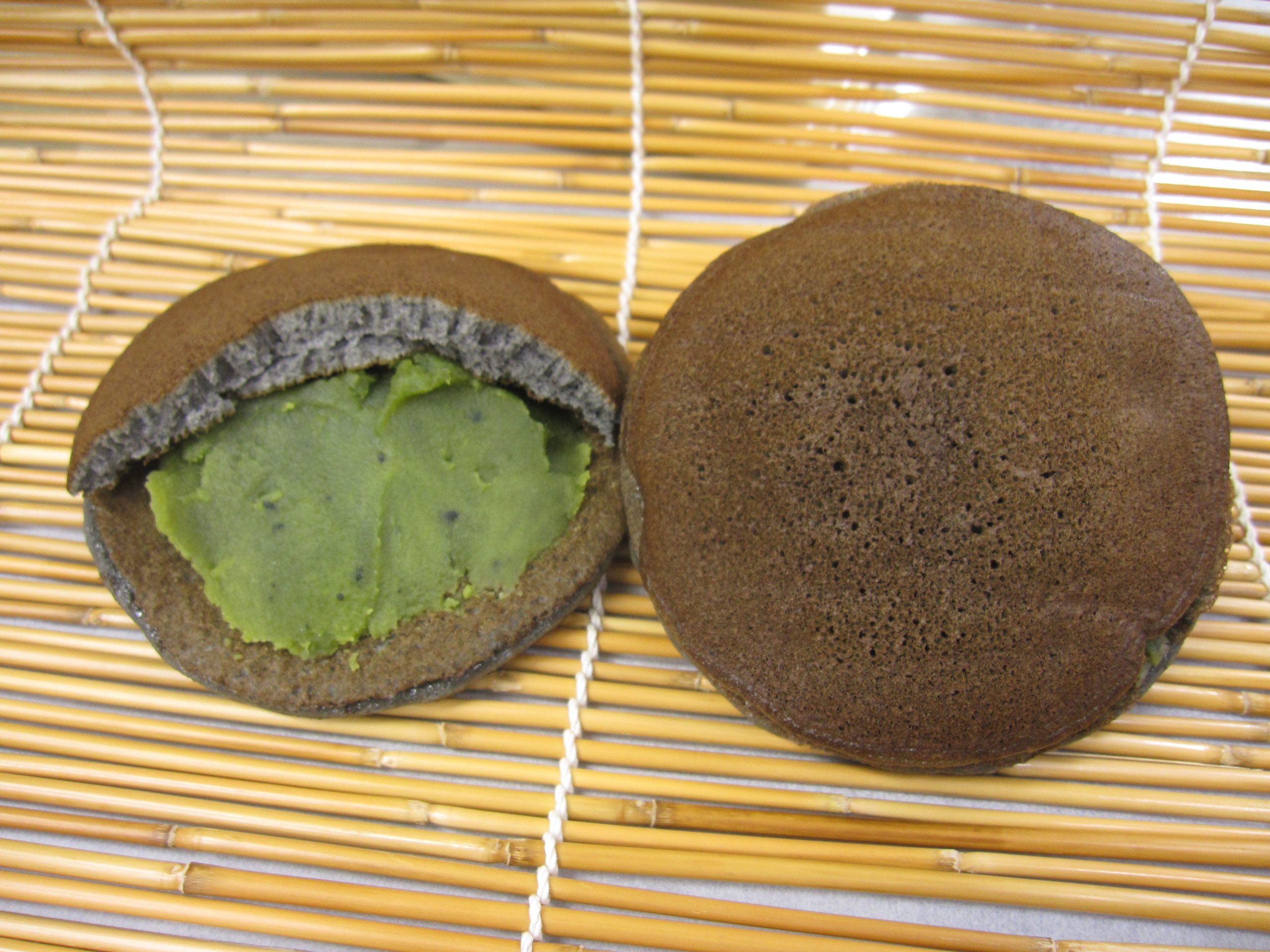 千葉市産竹炭パウタ-を生地に練り込んだ黒ちば銅鑼焼きです。竹炭が黒色にちなみ黒字になるよう日本中の隅から隅へ景気上昇の波が届けばと願いを込めて勝手ながら作りました。