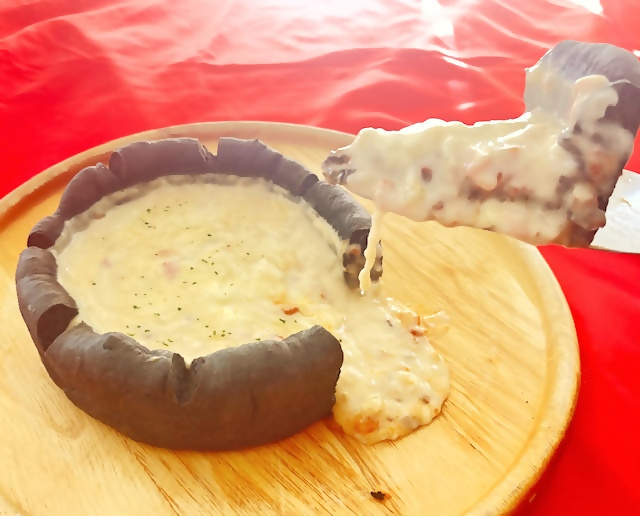 ●シカゴピザ(2,420円)雪崩れのようにとろけ落ちる当店オリジナルのチーズソースに千葉市産竹墨を練り込んだ黒色の生地との相性は抜群。