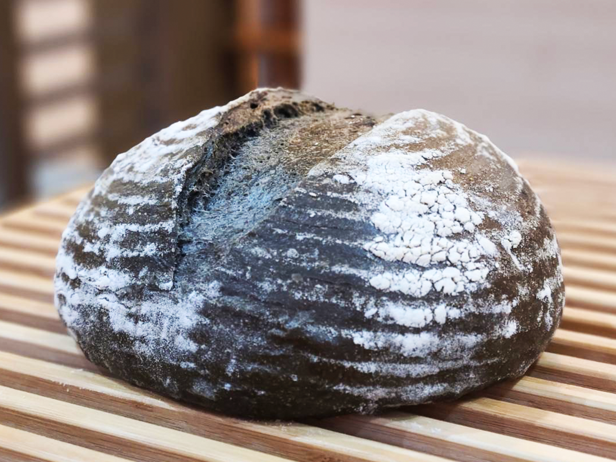 ●黒カンパーニュ(¥390)当店自慢のもちもちふわふわカンパーニュに竹炭パウダーを練りこみ真っ黒カンパーニュに。