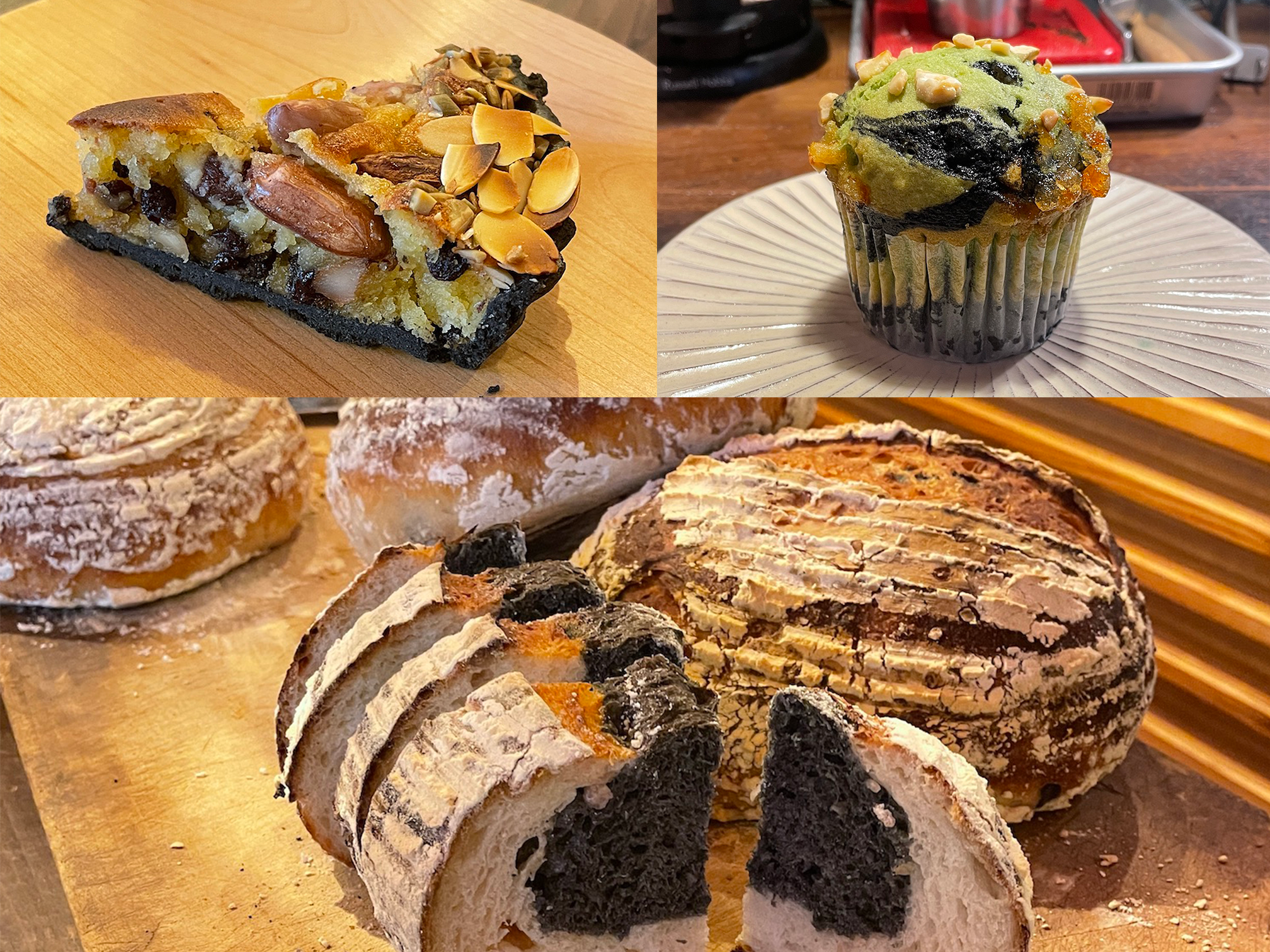 ●ルッコラと胡桃と竹炭とオレンジピールのマフィンなど日によって竹炭を使ったメニューが変わります。
