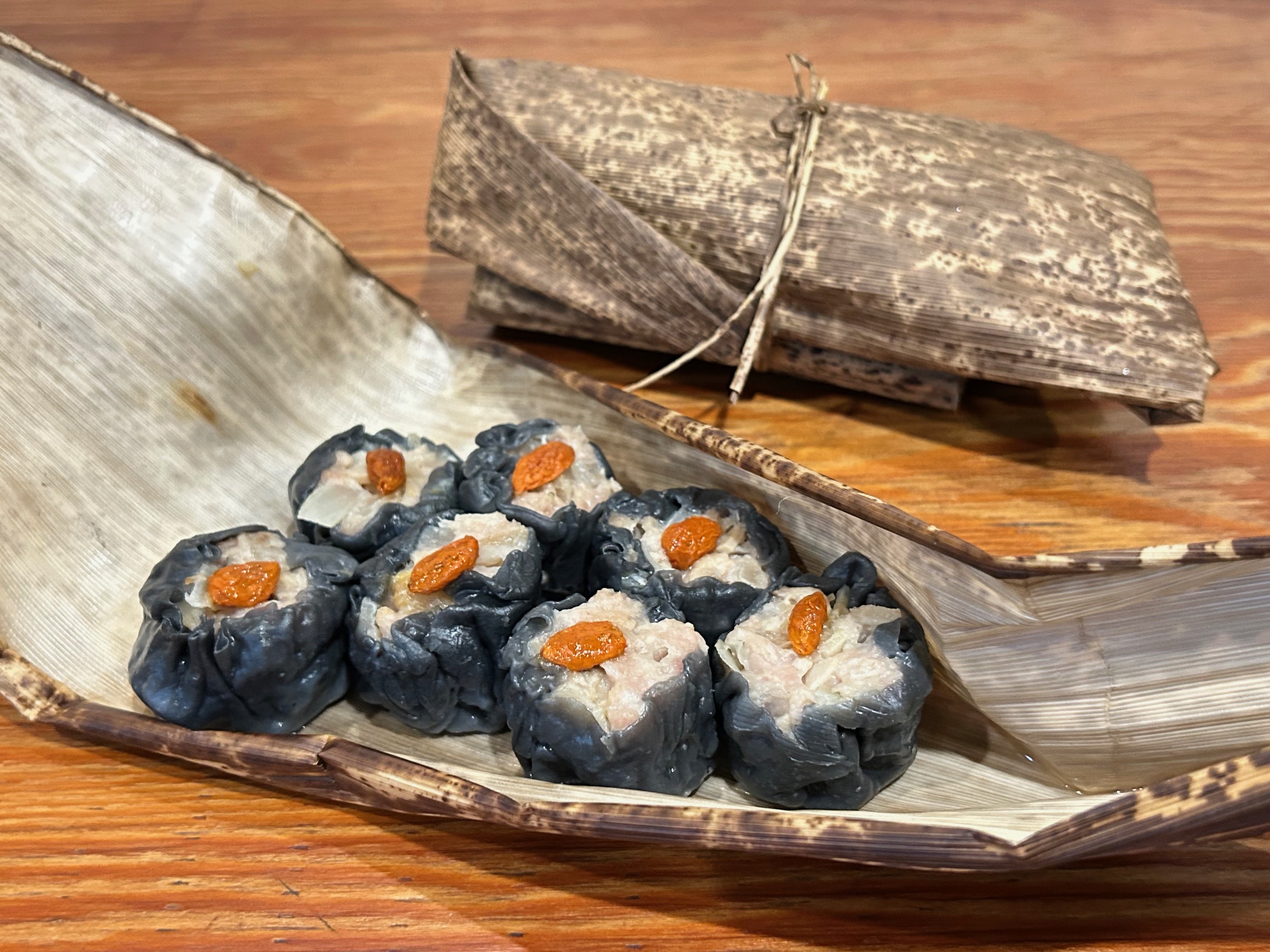●チバのたけのこ竹炭焼売(¥400)千葉の竹林整備で伐採した筍を塩漬けし、乳酸発酵させてから焼売にしました。皮は竹炭をねりこみ手仕事でひとつひとつ丁寧にのばし、焼売をにぎっています。