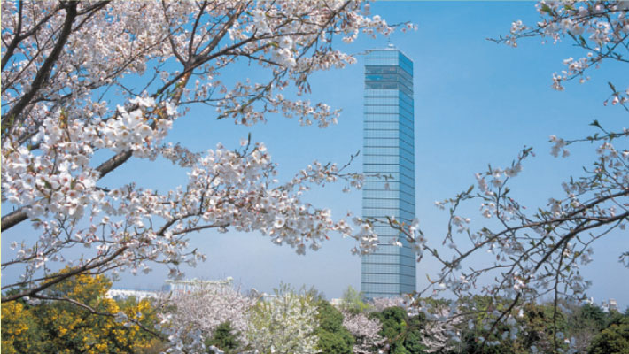 - ▲高さ125mの千葉ポートタワーと桜のコラボレーション