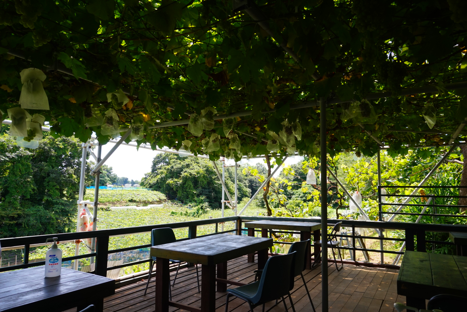 自然の恵みがいっぱいのぶどう棚の下で巨峰、安芸クイーンや珍しい品種のぶどうが試食できます。ぶどう畑が眺められる高台にあるテラスでゆっくりできます。