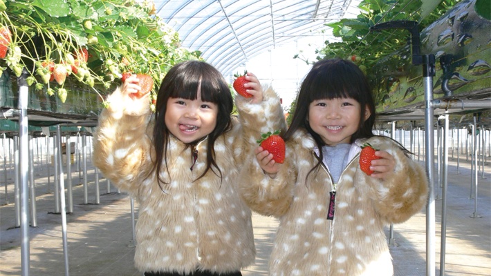 1500坪の面積を誇る、県内屈指の大型観光イチゴ園。清潔感あふれるハウス内はすべて高設栽培で摘み取りも楽々。子どもたちが遊べる手作りのミニアスレチックや休憩スペースなど、イチゴ狩り後の楽しみも充実しています。直売所では、イチゴの直売やアイスクリームなどの販売も。人気の園につき、早めのお出かけをおすすめします。