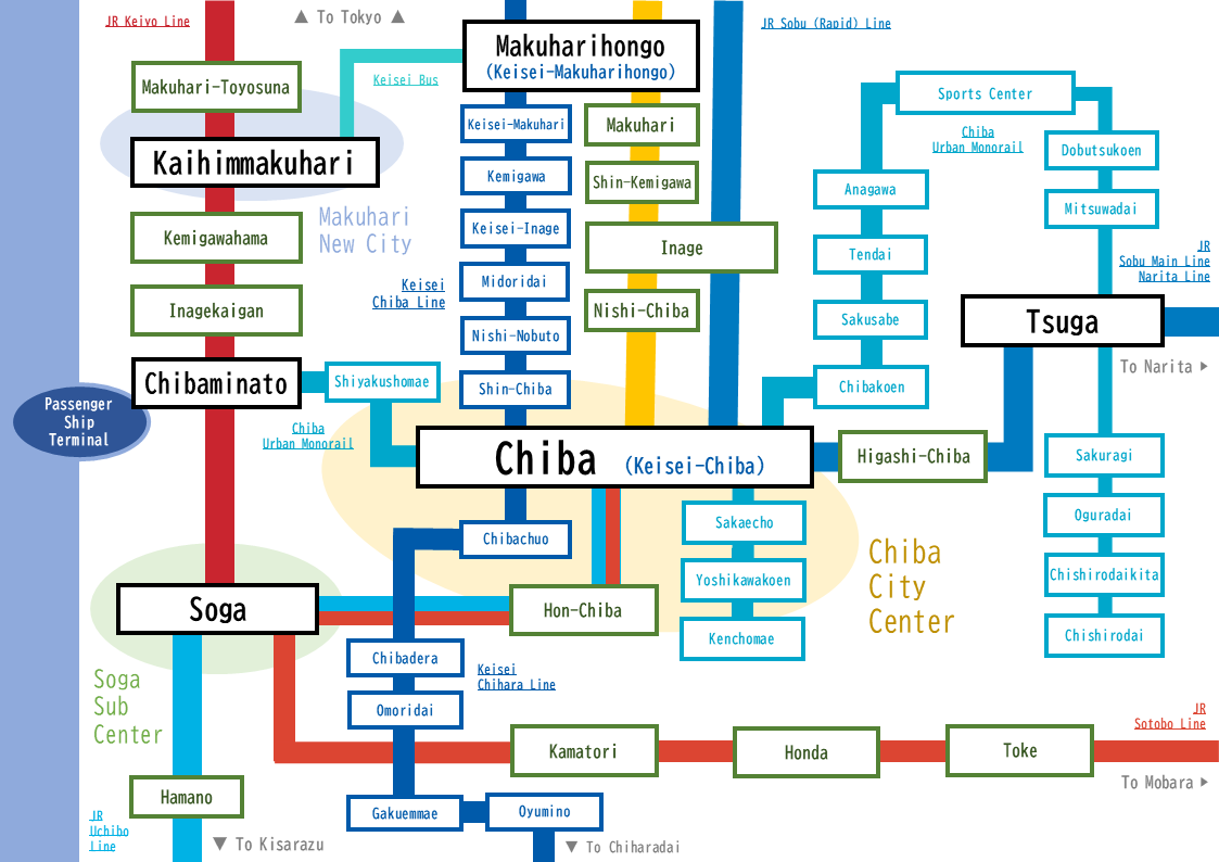 Approximately 30 minutes on the JR Sobu Rapid Line ( Tokyo Station – Chiba Station )Approximately 42 minutes by JR Keiyo Line ( Rapid ) ( Tokyo Station – Soga Station ) -