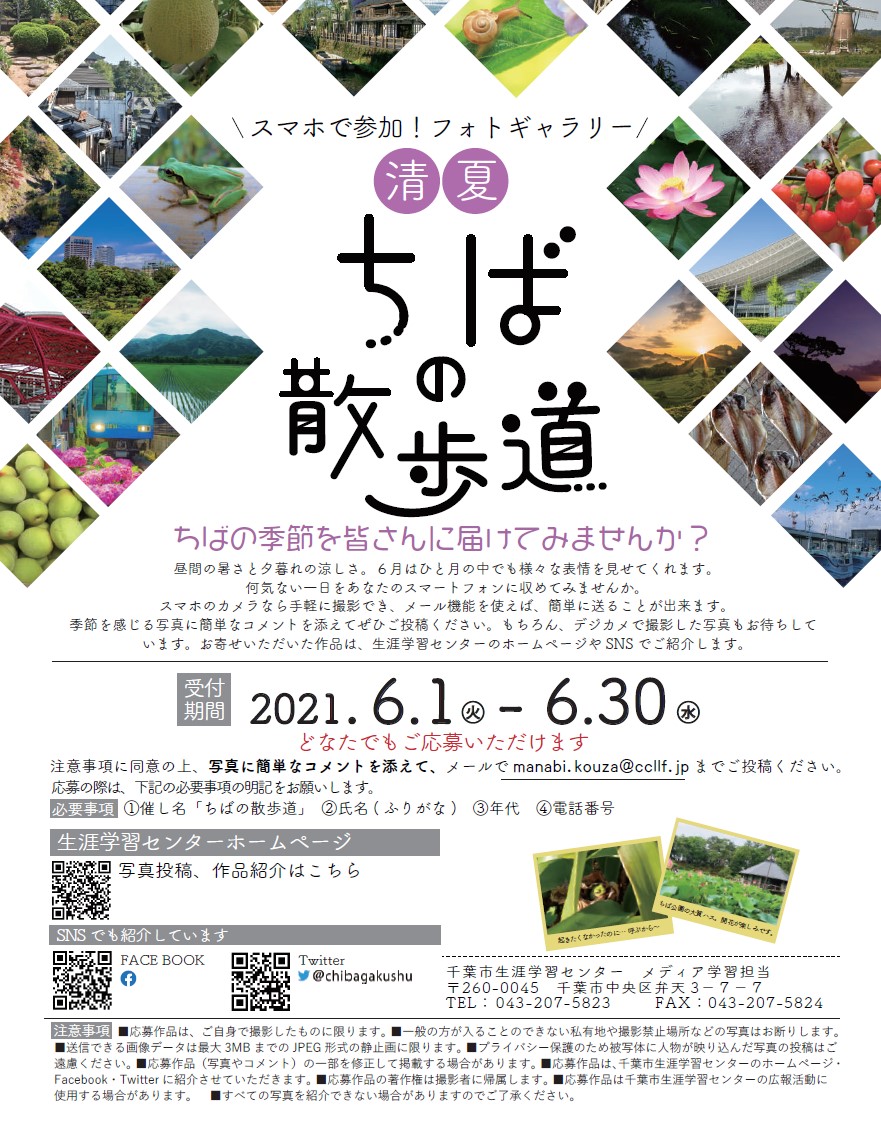 | 申込方法 | 注意事項に同意の上、写真に簡単なコメントを添えてメールでお申し込みください。 応募の際は、下記の必要事項の明記をお願いします。 ①催し名「ちばの散歩道」②氏名(ふりがな)③年代④電話番号 【重要】 「manabi.kouza@ccllf.jp」からのメールを受け取れるように設定してください。 お申し込み日から4日過ぎても連絡がない場合は、お申込みメールが届いていない可能性がありますので、必ずお問い合わせください。 ※締切は、6/30 (水曜) 必着です。 ※詳しくは下記URLをご覧下さい。 |