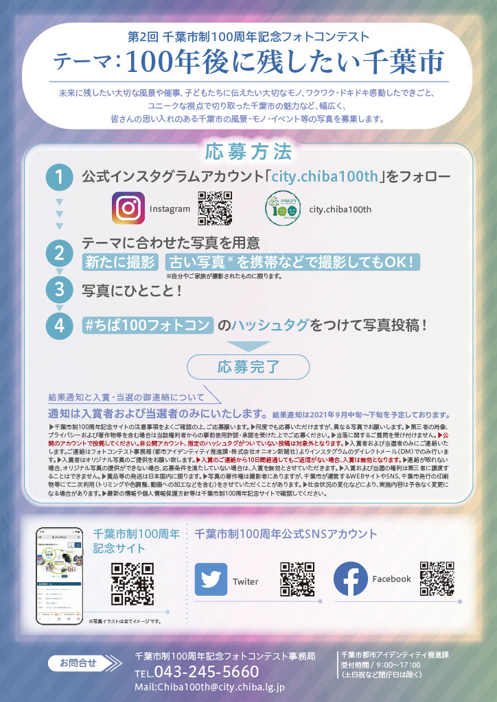 | お問合せ | 千葉市総合政策局総合政策部都市アイデンティティ推進課 TEL:043-245-5660 FAX:043-245-5476 E-mail:chiba100th@city.chiba.lg.jp |