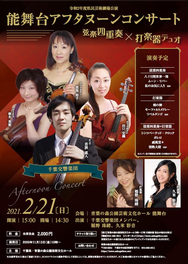 千葉県が誇るプロオーケストラ、千葉交響楽団メンバー(弦楽四重奏)と打楽器デュオによるコンサートを能舞台で開催します。普段とは異なる会場での音色の響きをお楽しみください。