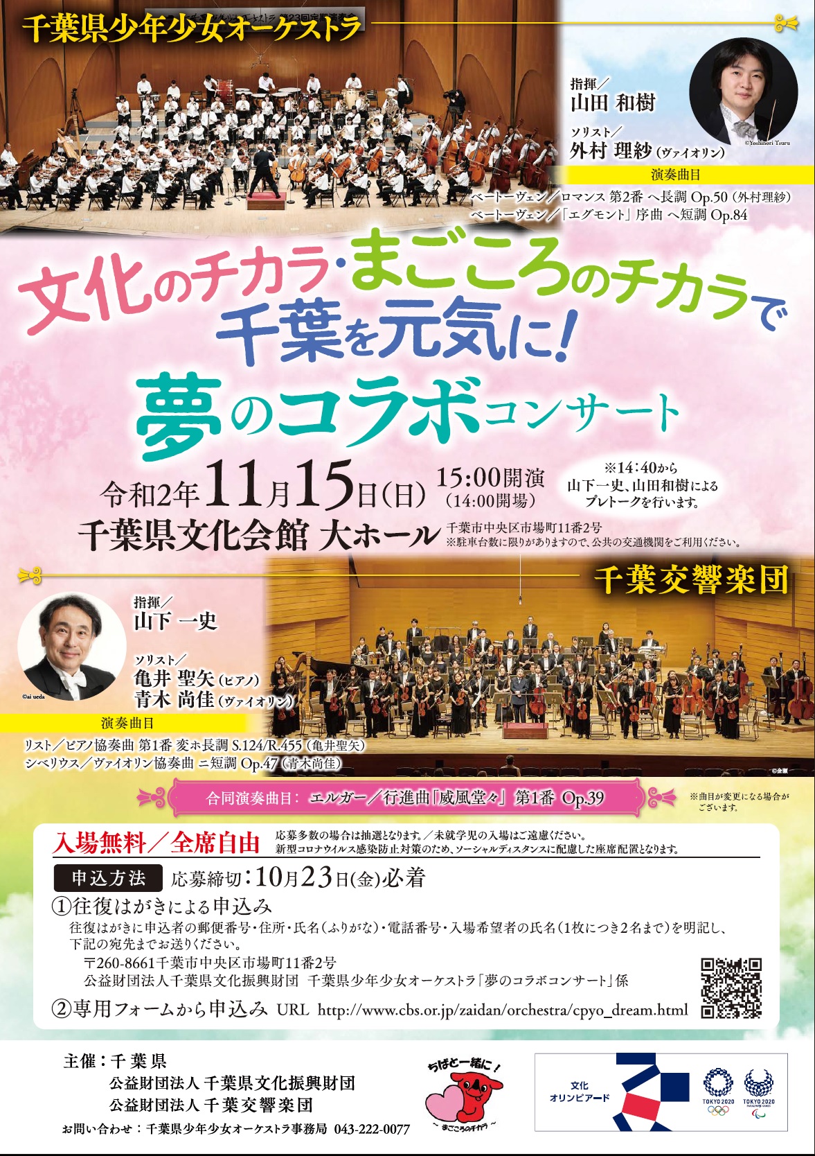 | 申込方法 | ①応募はがきによる申込み 往復はがきに申込者の郵便番号・住所・氏名(ふりがな)・電話番号・入場希望者の氏名(1枚につき2名まで)を明記し、下記の宛先までお送りください。 〒260-8661千葉市中央区市場町11番2号 公益財団法人千葉県文化振興財団 千葉県少年少女オーケストラ「夢のコラボコンサート」係 ②専用フォームから申込み URK http://www.cbs.or.jp/zaidan/orchestra/cpyo_dream.html ※応募締切:10月23日(金曜)必着 |