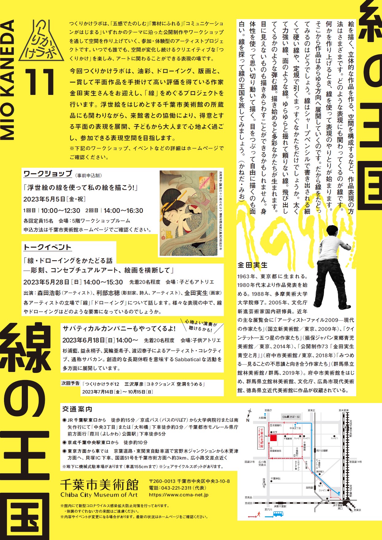 今回のつくりかけラボは、油彩、ドローイング、版画と、一貫して平面作品を手掛けて高い評価を得ている作家 金田実生さんをお迎えし、「線」をめぐるプロジェクトを 行います。浮世絵をはじめとする千葉市美術館の所蔵品にも関わりながら、来館者との協働により、得意とする平面の表現を展開、子どもから大人まで心地よく過ごし、参加できる表現空間を目指します。