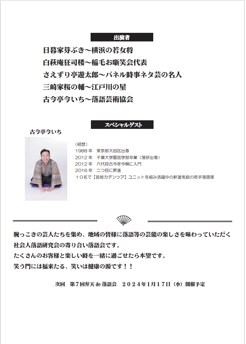 | 主催者 | 千葉市生涯学習センター 学習推進グループ 企画・運営:稲毛お噺笑会 |