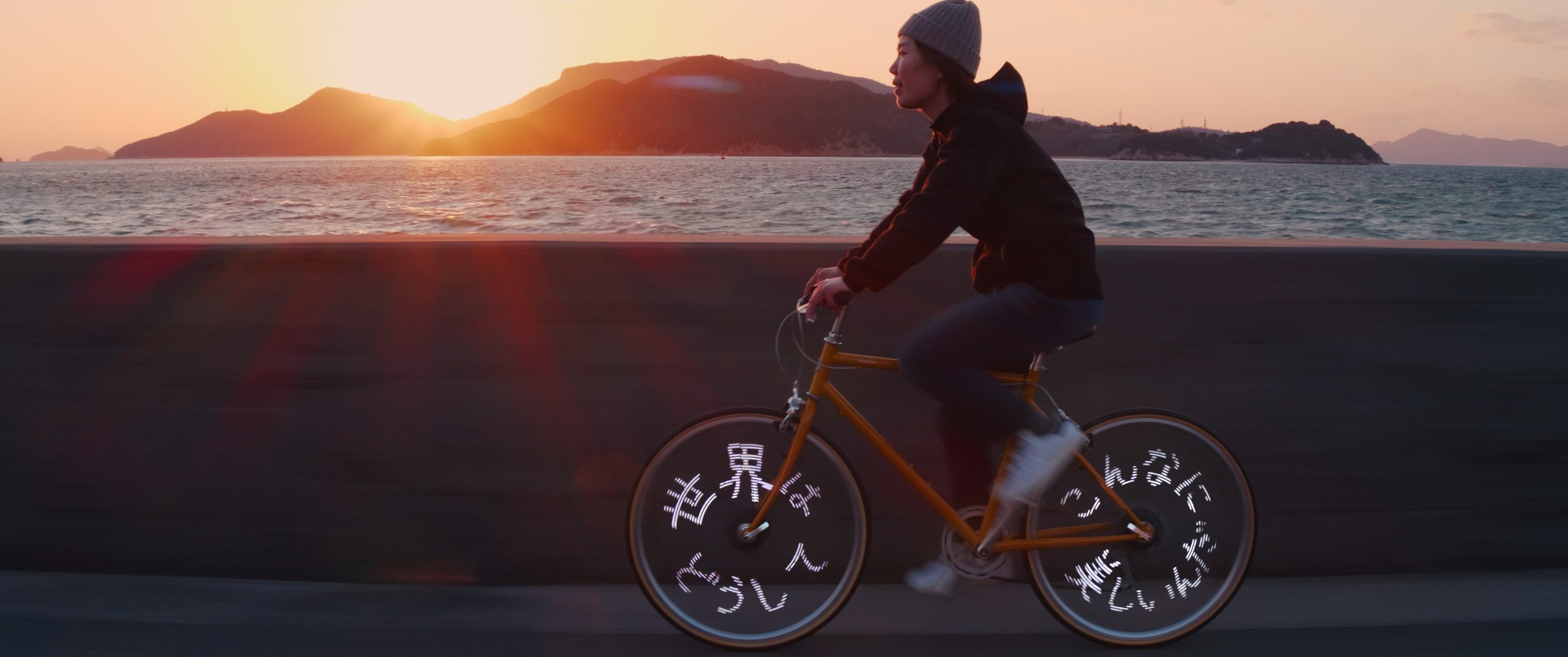 瀬戸内の夕陽と美しい風景を背にして自転車を走らせ、車輪に取り付けたLEDライトの残像効果で「世界はどうしてこんなに美しいんだ」という言葉を浮かび上がらせる映像作品《世界はどうしてこんなに美しいんだ》(令和元[2019]年)。千葉県飯岡海岸で集めた砂鉄から1本のスプーンを鋳造するまでを記録した映像と併せて、そのスプーンを砂山の上に展示する《A Spoon Made From The Land》(平成21[2009]年)。富山県生地海岸の堤防に巨大な「m」型の看板を設置し、蜃気楼を介して「∞」のイメージが浮かび上がる様子をリアルタイムで映し出すプロジェクト、《infinity~mirage》(令和3[2021]年)。山下+小林は自身の行為や自然現象を媒介とした作品を通して、人、自然、社会相互の関係性や価値観についての問いを投げかける。