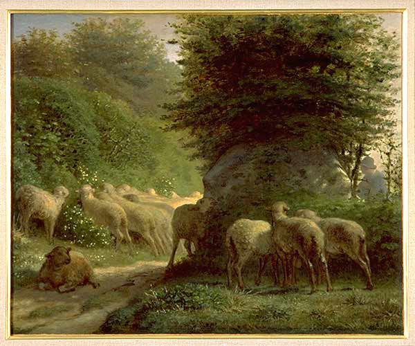 《垣根に沿って草を食む羊》
