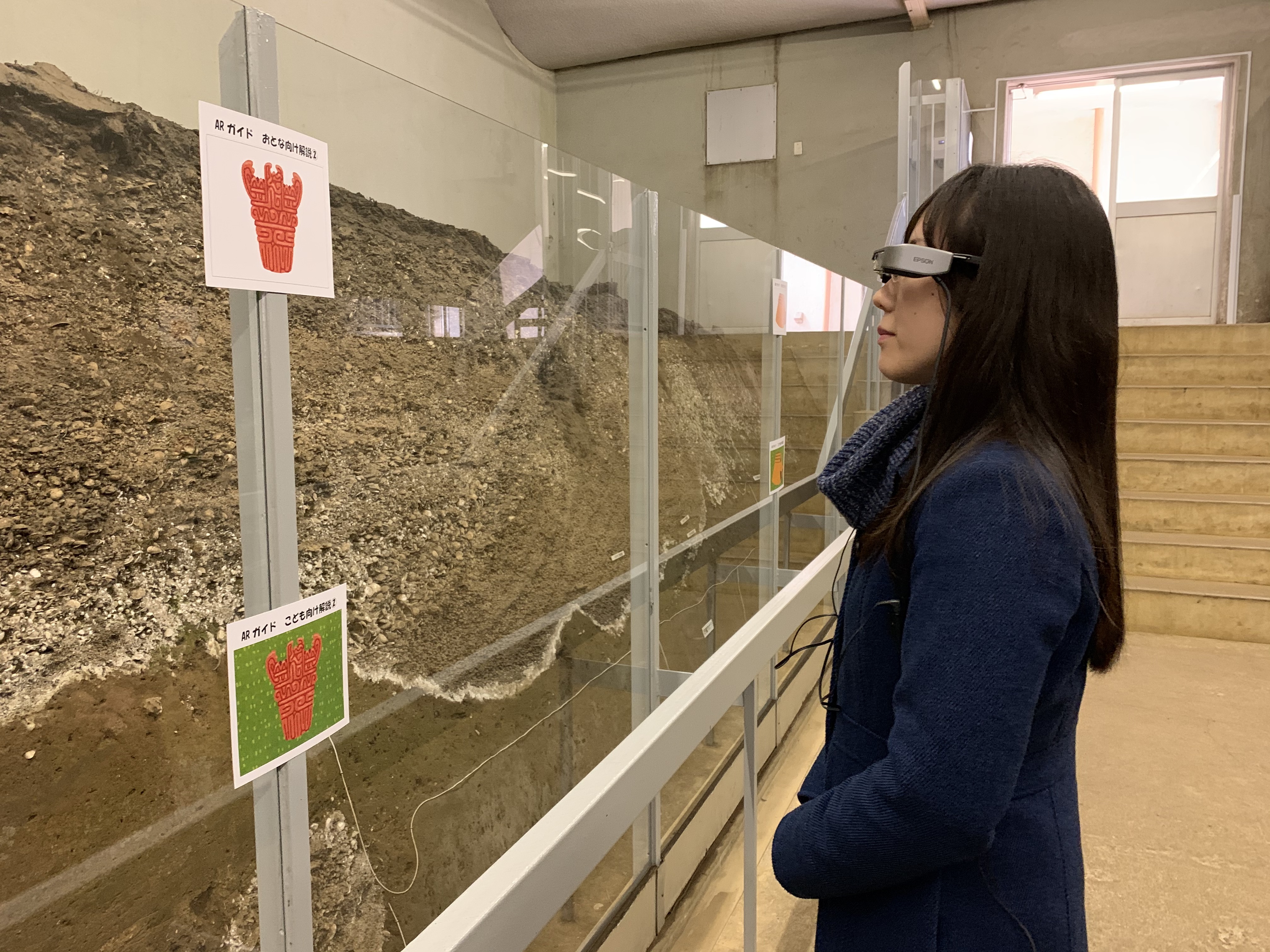 令和元年度まで発掘調査を行った場所で、スマートグラスを利用したAR体験です。