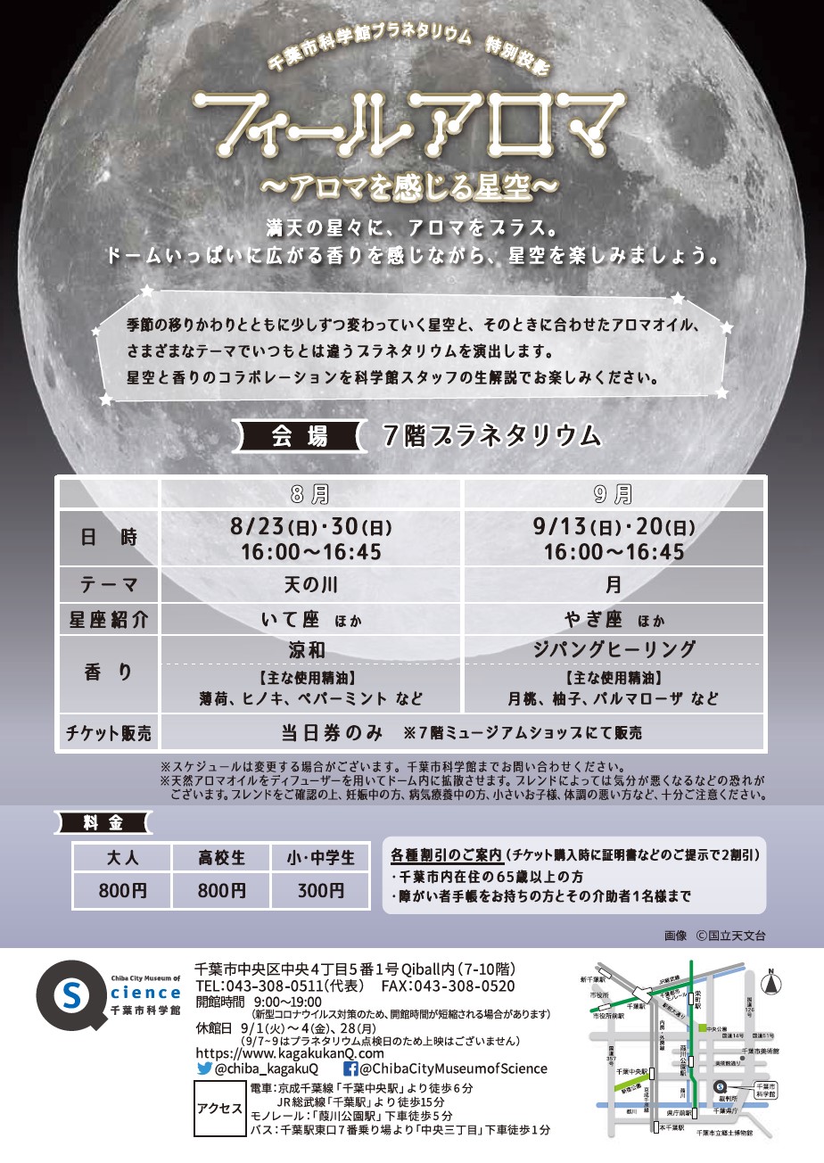 | 備考 | <休館日>9月28日(月曜) ※9月7日(月曜)~9日(水曜)はプラネタリウム点検日のため、上映はありません。 ※新型コロナウイルス感染症の影響により、内容の変更・中止の可能性があります。あらかじめご了承ください。 ※スケジュールは変更する場合がございます、千葉市科学館までお問い合わせください。 ※天然アロマオイルをディフューザーを用いてドーム内に拡散させます。ブレンドによっては気分が悪くなるなどの恐れがございます。ブレンドをご確認の上、妊娠中の方、病気療養中の方、小さいお子様、体調の悪い方など十分ご注意ください。 |
